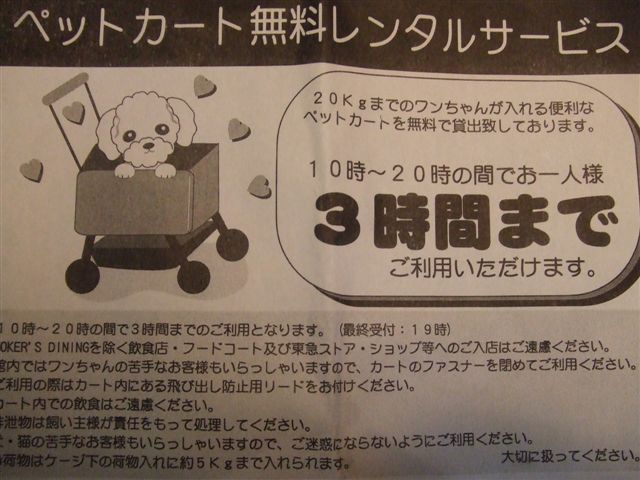 駐車場からワンコも乗用可のエレベーターで1Fへ。そこから外の道路をぐるっと回って、貸し出しをしてくれるペットショップへ。雨の日は大変そう・・・。身分証明書を提示して、ペットカートを借りて、さあ店内へ。