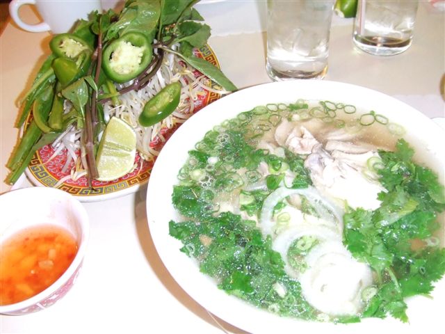 鳥のフォー(小)をオーダー。フォーと一緒に、生のもやし、スイートバジル、ライム、チリが運ばれてきます。それを好みで入れて食べます。