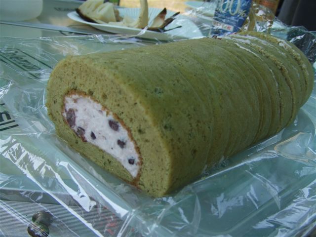 抹茶味のスポンジに小豆味のクリームを巻きました。