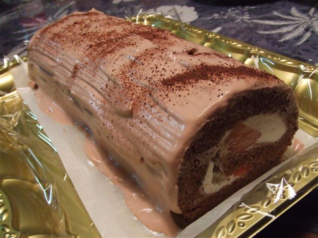 チョコレートの生地に、生クリームとイチゴをまいて、チョコ生クリームでデコレーション。