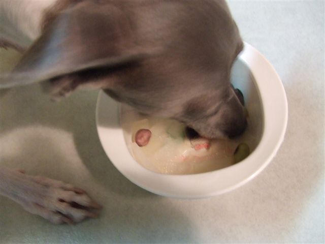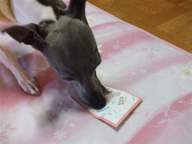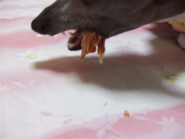 袋を鼻先で破いて、必死に中身を食べようとしています。
