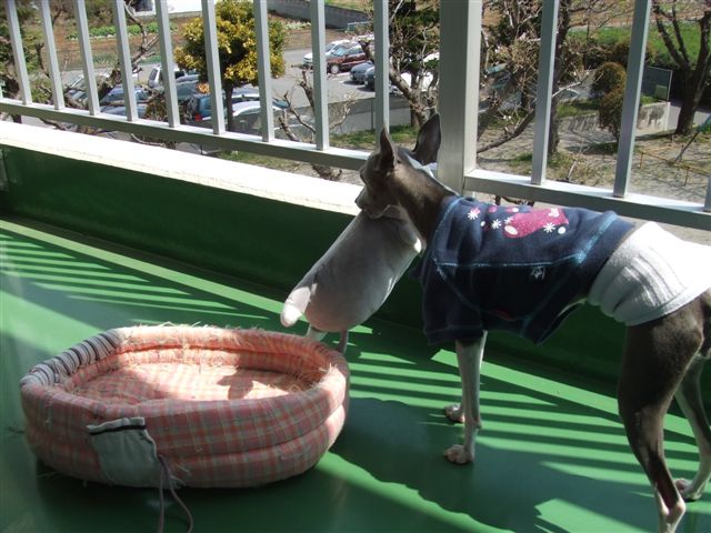 箱から出したワンコは、不思議そうに辺りの様子を見てました。