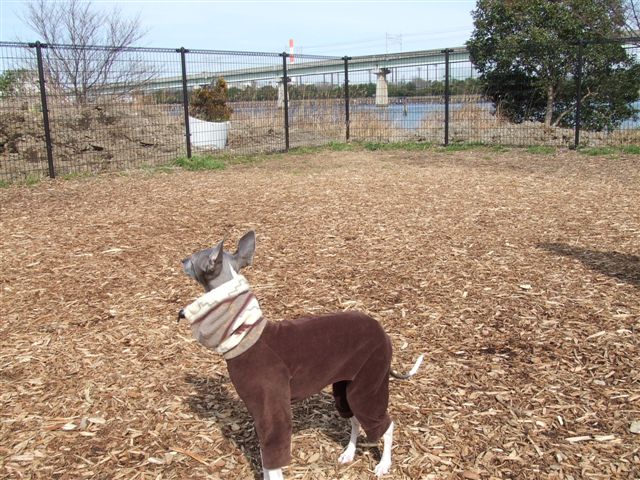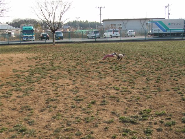 昨日は2月とは思えない暖かさ、久しぶりに姉妹犬のキキちゃんを誘って、柏の葉ドックランへ。