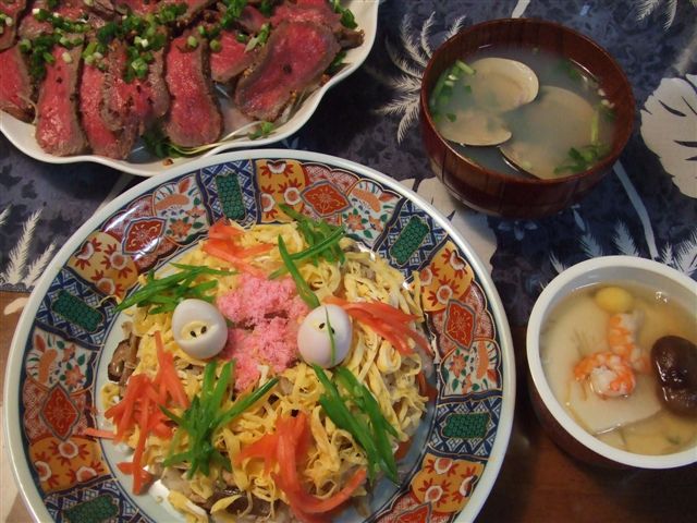夜は、お決まりの五目寿司と茶碗蒸し、ハマグリのうしお汁、そして、和風ローストビーフでした。