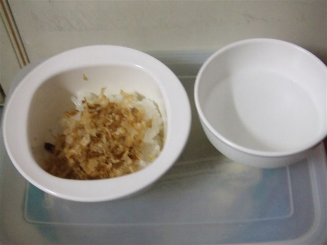 それでも、少しでもなんとか食べさせたくって、作るのがコレ”おかかのおかゆ”です。やっぱり下痢にはおかゆでしょ。でも、獣医さんに言ったら、いつものフードをふやかしてあげたほうがいいって