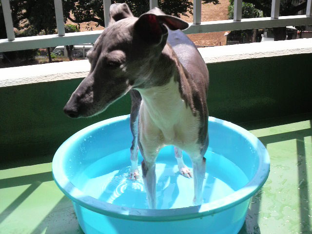 あまりに暑そうなので、ベランダにタライを出して行水をさせてみました。