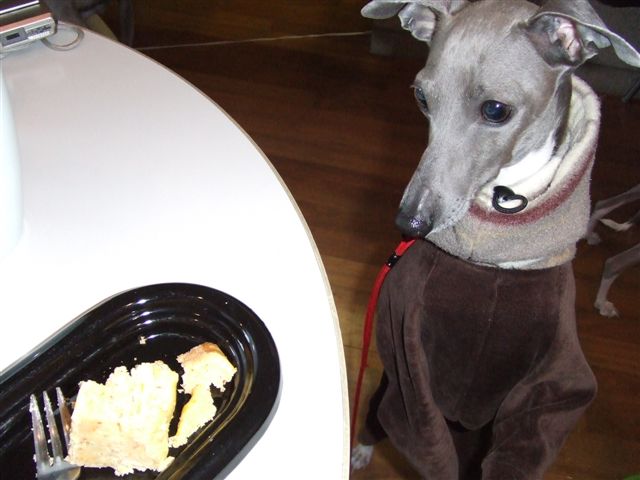 サフィーはケーキが来た途端、我慢できずにかぶりつき、取り上げられて「待て」をさせられている所です。サフィーは食いしん坊だね