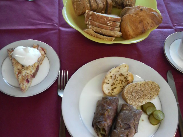 今回のメニューは、牛肉にマスタードを塗ってピクルス(手作り)、玉ねぎ、ベーコンを巻いて焼いた、「牛肉のロール巻き」「ベークドポテト」「ピクルス」「リンゴのケーキ」の4品です。